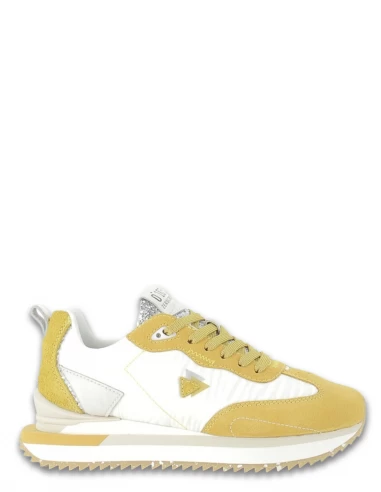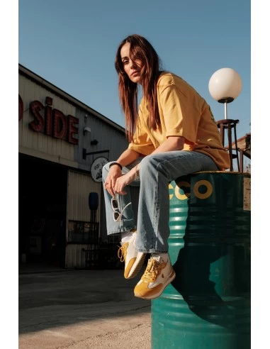 Elle présente une tige en nylon jaune ainsi qu’une semelle avec pop couleur jaune en rappel.