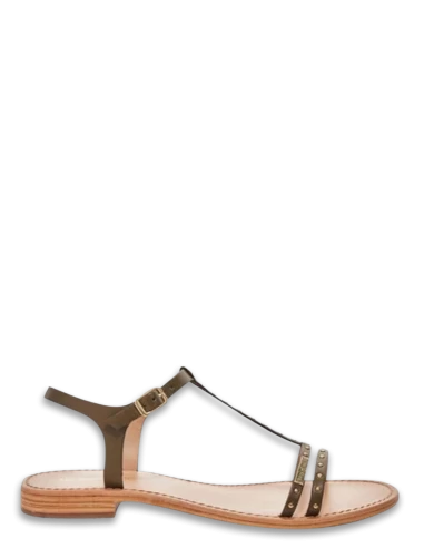 Ce modèle en cuir lisse Kaki présente des rangées de petits clous dorés sur le coup de pied.