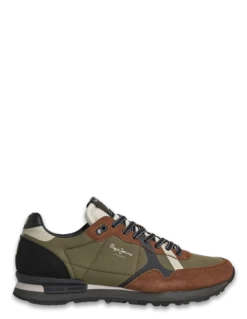 Sa tige mixe suède marron et toile kaki montée sur une semelle running noire.