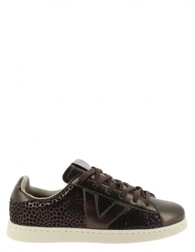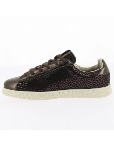 Cette chaussure présente une tige en cuir capuccino métallisé et un motif animalier sur la partie latérale.
